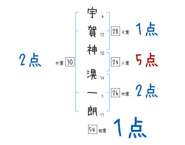外運![]() | 宇賀神滉一朗さんの外運は30画の2つ星!浮き沈みの激しさに注意しましょう。 生活面を象徴する運勢です。外部から受ける影響力を表し、結婚運、家庭運や職場、環境への順応性を表します。 |