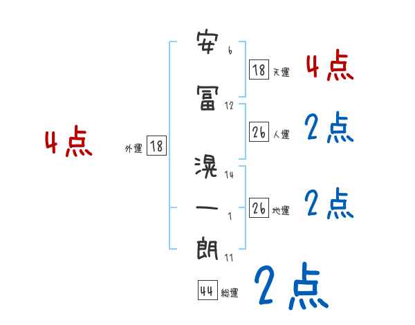 総運![]() | 安冨滉一朗さんの総運は44画の2つ星!誠実で慎重な性格。物事を考えすぎないように注意しましょう。 あなたの人生を表す1番重要な運勢です。生涯を通じて影響する総合運となり、主に50歳以降の晩年期に影響を及ぼします。 |