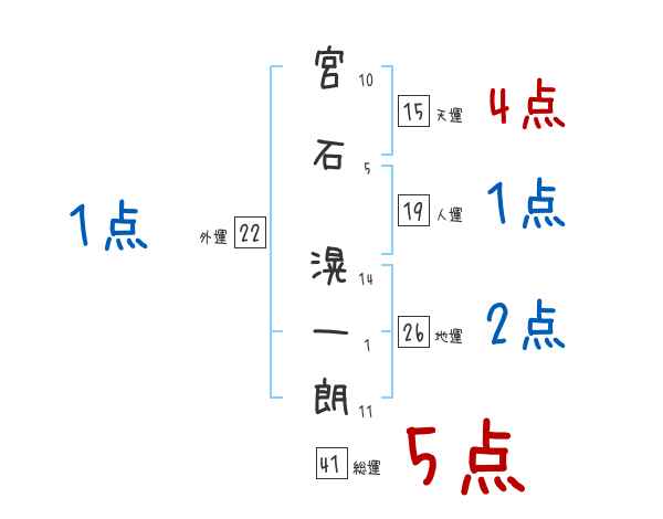 外運![]() | 宮石滉一朗さんの外運は22画の1つ星!努力することが苦手ないっぽう手先が器用。芸術性にも優れる。 生活面を象徴する運勢です。外部から受ける影響力を表し、結婚運、家庭運や職場、環境への順応性を表します。 |