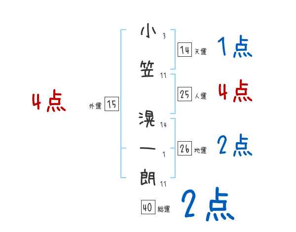 天運![]() | 小笠滉一朗さんの天運は14画の1つ星!人に対して優しいがストレスを溜め込みがち。人間関係のトラブルを避けるよう気をつけましょう。 家系が持つ宿命的な運勢を表します。祖先から受け継いだ苗字ですので自分の力が及びません。家柄を象徴します。 |