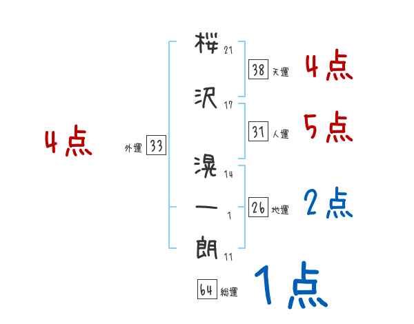 外運![]() | 桜沢滉一朗さんの外運は33画の4つ星!権力志向でプライドが高い。勇気があり運を切り開き成功する。 生活面を象徴する運勢です。外部から受ける影響力を表し、結婚運、家庭運や職場、環境への順応性を表します。 |