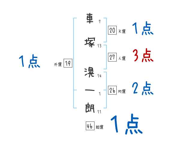 人運![]() | 車塚滉一朗さんの人運は27画の3つ星!頭脳明晰だが強情で摩擦が多い傾向。孤立に注意。 性格や才能などを表す2番目に重要な運勢です。人間関係や協調性、社会的な成功に影響します。主に20歳から50歳ぐらいまでの中年期の運勢を表します。 |