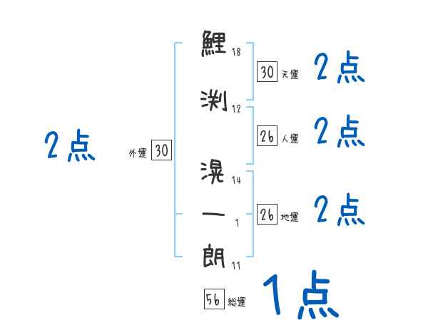 天運![]() | 鯉渕滉一朗さんの天運は30画の2つ星!浮き沈みの激しさに注意しましょう。 家系が持つ宿命的な運勢を表します。祖先から受け継いだ苗字ですので自分の力が及びません。家柄を象徴します。 |