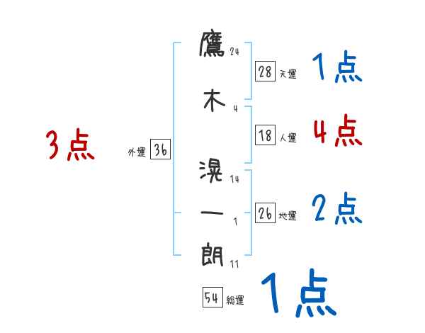 外運![]() | 鷹木滉一朗さんの外運は36画の3つ星!先見性が豊かです。多少神経質で苦労することも。 生活面を象徴する運勢です。外部から受ける影響力を表し、結婚運、家庭運や職場、環境への順応性を表します。 |