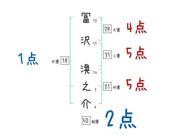 総運![]() | 冨沢滉之介さんの総運は50画の2つ星!浮き沈みが激しく不安定。しりすぼみに衰退しやすいので注意しましょう。 あなたの人生を表す1番重要な運勢です。生涯を通じて影響する総合運となり、主に50歳以降の晩年期に影響を及ぼします。 |