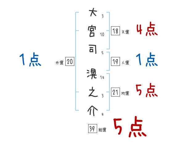 天運![]() | 大宮司滉之介さんの天運は18画の4つ星!情熱的で剛気。忍耐力があり信頼される。 家系が持つ宿命的な運勢を表します。祖先から受け継いだ苗字ですので自分の力が及びません。家柄を象徴します。 |