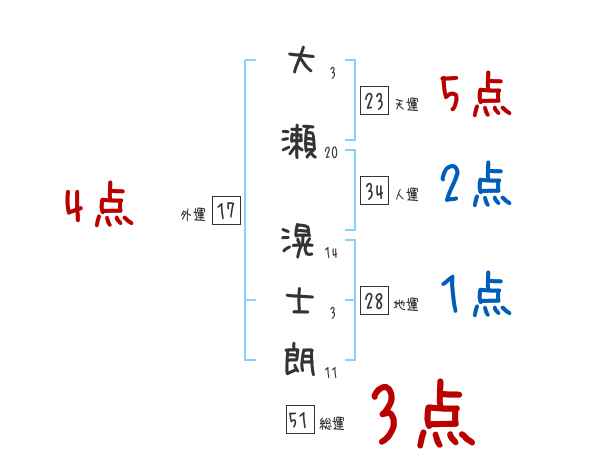 天運![]() | 大瀬滉士朗さんの天運は23画の5つ星!想像力に優れ活力がある。一代で成功し名誉を手に入れる。 家系が持つ宿命的な運勢を表します。祖先から受け継いだ苗字ですので自分の力が及びません。家柄を象徴します。 |