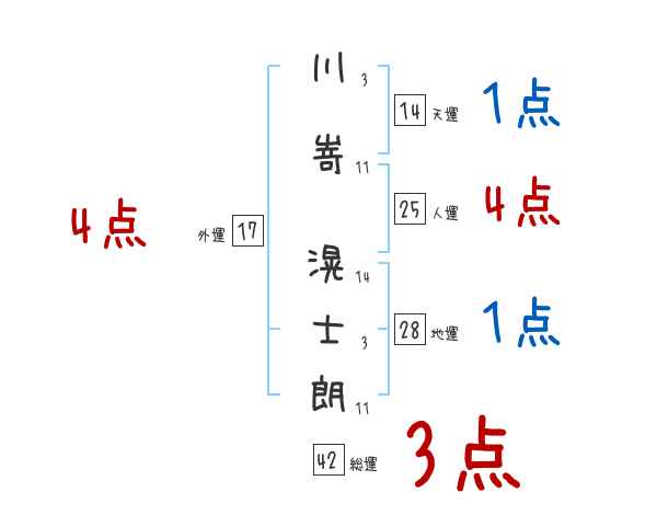 外運![]() | 川嵜滉士朗さんの外運は17画の4つ星!積極的な行動力。地位を気づき財産を手に入れる。純粋な心と直感力。 生活面を象徴する運勢です。外部から受ける影響力を表し、結婚運、家庭運や職場、環境への順応性を表します。 |