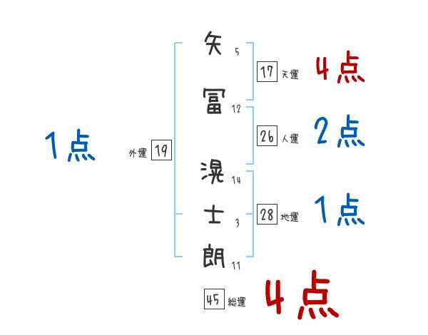 天運![]() | 矢冨滉士朗さんの天運は17画の4つ星!積極的な行動力。地位を気づき財産を手に入れる。純粋な心と直感力。 家系が持つ宿命的な運勢を表します。祖先から受け継いだ苗字ですので自分の力が及びません。家柄を象徴します。 |