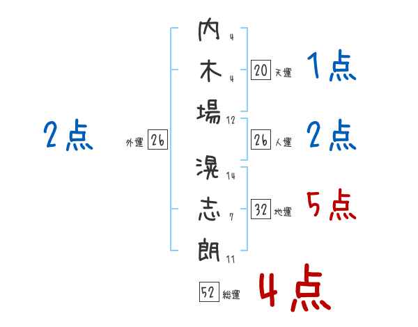 外運![]() | 内木場滉志朗さんの外運は26画の2つ星!波瀾万丈かも。信頼できる人を大事にしましょう。 生活面を象徴する運勢です。外部から受ける影響力を表し、結婚運、家庭運や職場、環境への順応性を表します。 |