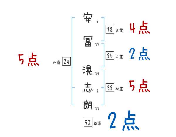 天運![]() | 安冨滉志朗さんの天運は18画の4つ星!情熱的で剛気。忍耐力があり信頼される。 家系が持つ宿命的な運勢を表します。祖先から受け継いだ苗字ですので自分の力が及びません。家柄を象徴します。 |