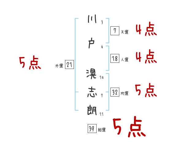 総運![]() | 川戸滉志朗さんの総運は39画の5つ星!社交性に優れ人望が厚い。人の上に立ち成功する。 あなたの人生を表す1番重要な運勢です。生涯を通じて影響する総合運となり、主に50歳以降の晩年期に影響を及ぼします。 |