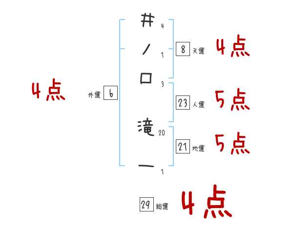 総運![]() | 井ノ口滝一さんの総運は29画の4つ星!完全主義で才能がある。厳格な心の持ち主。 あなたの人生を表す1番重要な運勢です。生涯を通じて影響する総合運となり、主に50歳以降の晩年期に影響を及ぼします。 |