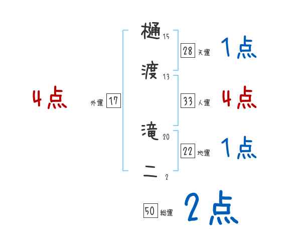 外運![]() | 樋渡滝二さんの外運は17画の4つ星!積極的な行動力。地位を気づき財産を手に入れる。純粋な心と直感力。 生活面を象徴する運勢です。外部から受ける影響力を表し、結婚運、家庭運や職場、環境への順応性を表します。 |