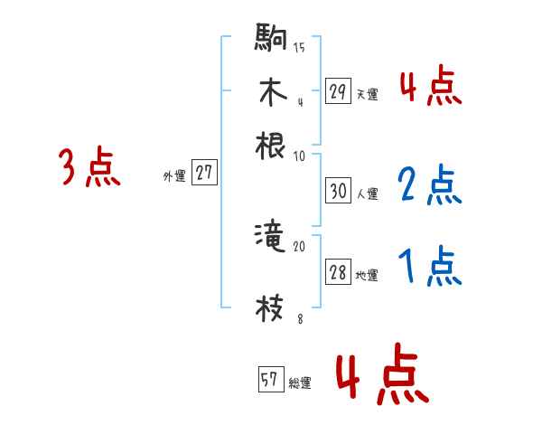 総運![]() | 駒木根滝枝さんの総運は57画の4つ星!向上心があり人望がある。地位を得る。 あなたの人生を表す1番重要な運勢です。生涯を通じて影響する総合運となり、主に50歳以降の晩年期に影響を及ぼします。 |