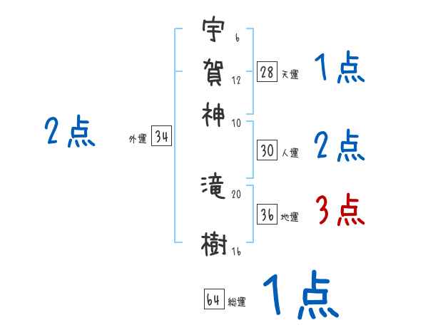 天運![]() | 宇賀神滝樹さんの天運は28画の1つ星!家庭環境に注意。スポーツで活躍できる能力があるかも。 家系が持つ宿命的な運勢を表します。祖先から受け継いだ苗字ですので自分の力が及びません。家柄を象徴します。 |