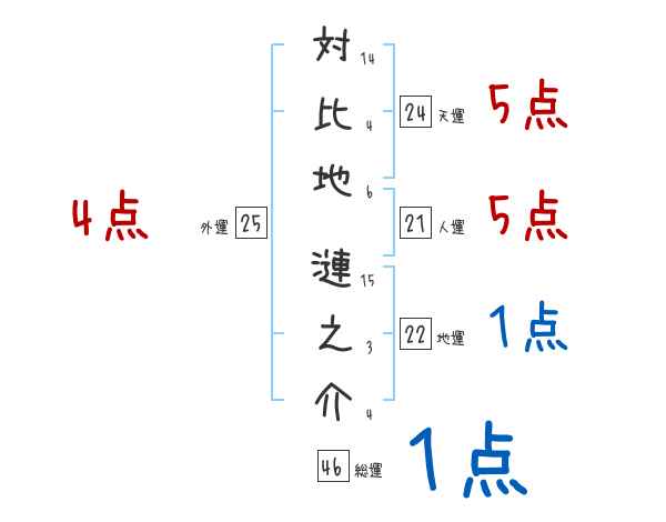 地運![]() | 対比地漣之介さんの地運は22画の1つ星!努力することが苦手ないっぽう手先が器用。芸術性にも優れる。 個性を表す基礎的な運勢です。性格形成や対人関係、行動力など家庭環境に影響されます。主に誕生してから20歳くらいまでの若年期の運勢を表します。 |