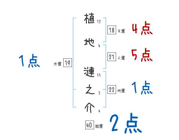 外運![]() | 植地漣之介さんの外運は19画の1つ星!優れた才能を持ちますが、協調性が足りないことも。周りの人と協力する事を意識しましょう。 生活面を象徴する運勢です。外部から受ける影響力を表し、結婚運、家庭運や職場、環境への順応性を表します。 |