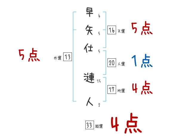 外運![]() | 早矢仕漣人さんの外運は13画の5つ星!才能に恵まれ人気がある。名声を手に入れる。円満な人生。 生活面を象徴する運勢です。外部から受ける影響力を表し、結婚運、家庭運や職場、環境への順応性を表します。 |