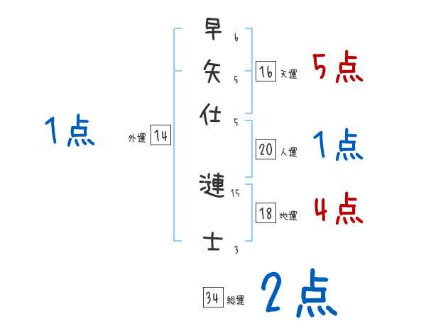 外運![]() | 早矢仕漣士さんの外運は14画の1つ星!人に対して優しいがストレスを溜め込みがち。人間関係のトラブルを避けるよう気をつけましょう。 生活面を象徴する運勢です。外部から受ける影響力を表し、結婚運、家庭運や職場、環境への順応性を表します。 |