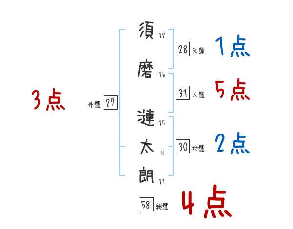 天運![]() | 須磨漣太朗さんの天運は28画の1つ星!家庭環境に注意。スポーツで活躍できる能力があるかも。 家系が持つ宿命的な運勢を表します。祖先から受け継いだ苗字ですので自分の力が及びません。家柄を象徴します。 |