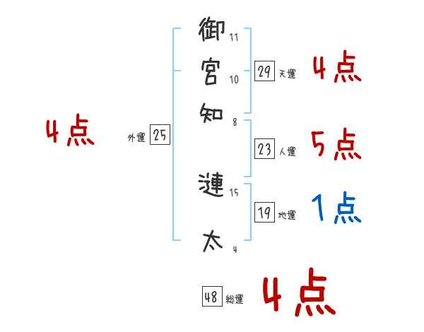 総運![]() | 御宮知漣太さんの総運は48画の4つ星!賢明な性格で人望が厚い。指導力があり多くの人に尊敬される。 あなたの人生を表す1番重要な運勢です。生涯を通じて影響する総合運となり、主に50歳以降の晩年期に影響を及ぼします。 |