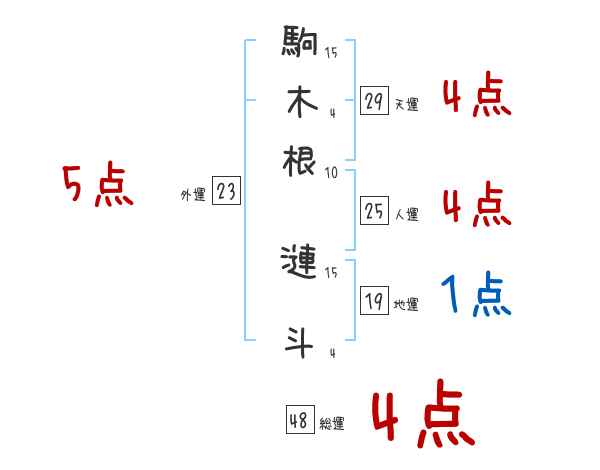 外運![]() | 駒木根漣斗さんの外運は23画の5つ星!想像力に優れ活力がある。一代で成功し名誉を手に入れる。 生活面を象徴する運勢です。外部から受ける影響力を表し、結婚運、家庭運や職場、環境への順応性を表します。 |