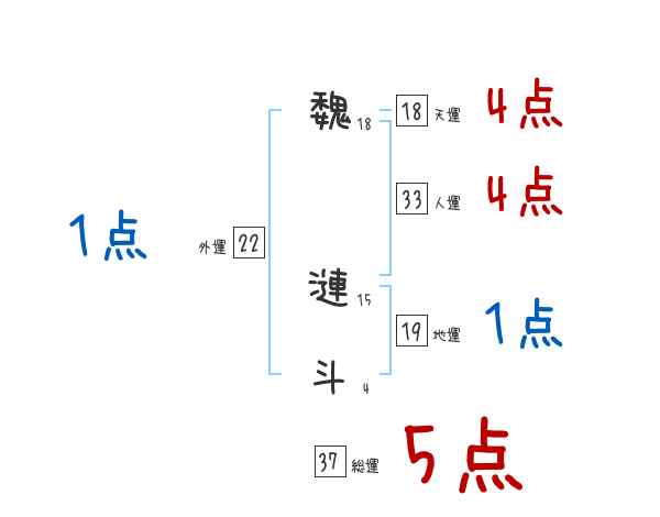 外運![]() | 魏漣斗さんの外運は22画の1つ星!努力することが苦手ないっぽう手先が器用。芸術性にも優れる。 生活面を象徴する運勢です。外部から受ける影響力を表し、結婚運、家庭運や職場、環境への順応性を表します。 |