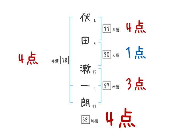 天運![]() | 伏田漱一朗さんの天運は11画の4つ星!着実に富や地位を得る幸運な人生。 家系が持つ宿命的な運勢を表します。祖先から受け継いだ苗字ですので自分の力が及びません。家柄を象徴します。 |