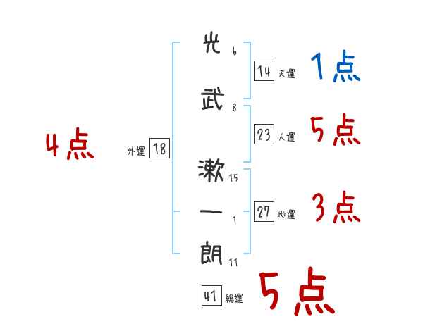 人運![]() | 光武漱一朗さんの人運は23画の5つ星!想像力に優れ活力がある。一代で成功し名誉を手に入れる。 性格や才能などを表す2番目に重要な運勢です。人間関係や協調性、社会的な成功に影響します。主に20歳から50歳ぐらいまでの中年期の運勢を表します。 |