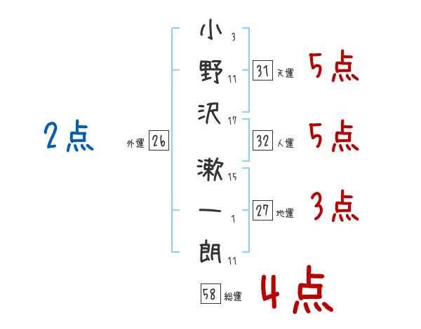 人運![]() | 小野沢漱一朗さんの人運は32画の5つ星!柔軟性があり成功する。チャンスが多く金運が良い。 性格や才能などを表す2番目に重要な運勢です。人間関係や協調性、社会的な成功に影響します。主に20歳から50歳ぐらいまでの中年期の運勢を表します。 |