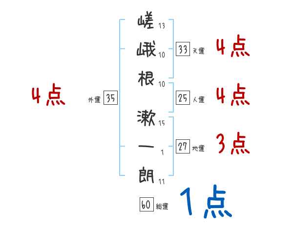 天運![]() | 嵯峨根漱一朗さんの天運は33画の4つ星!権力志向でプライドが高い。勇気があり運を切り開き成功する。 家系が持つ宿命的な運勢を表します。祖先から受け継いだ苗字ですので自分の力が及びません。家柄を象徴します。 |