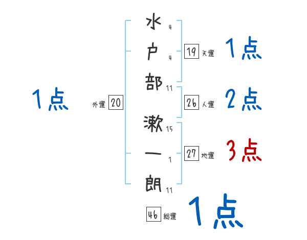 天運![]() | 水戸部漱一朗さんの天運は19画の1つ星!優れた才能を持ちますが、協調性が足りないことも。周りの人と協力する事を意識しましょう。 家系が持つ宿命的な運勢を表します。祖先から受け継いだ苗字ですので自分の力が及びません。家柄を象徴します。 |