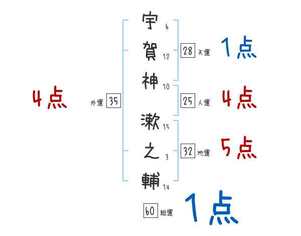 | 地運  | 宇賀神漱之輔さんの地運は32画の5つ星!柔軟性があり成功する。チャンスが多く金運が良い。個性を表す基礎的な運勢です。性格形成や対人関係、行動力など家庭環境に影響されます。主に誕生してから20歳くらいまでの若年期の運勢を表します。 |