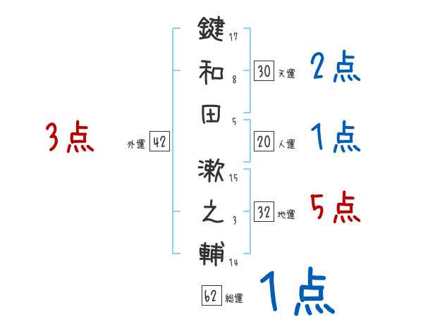 天運![]() | 鍵和田漱之輔さんの天運は30画の2つ星!浮き沈みの激しさに注意しましょう。 家系が持つ宿命的な運勢を表します。祖先から受け継いだ苗字ですので自分の力が及びません。家柄を象徴します。 |