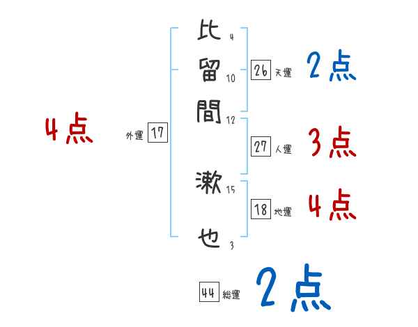 天運![]() | 比留間漱也さんの天運は26画の2つ星!波瀾万丈かも。信頼できる人を大事にしましょう。 家系が持つ宿命的な運勢を表します。祖先から受け継いだ苗字ですので自分の力が及びません。家柄を象徴します。 |