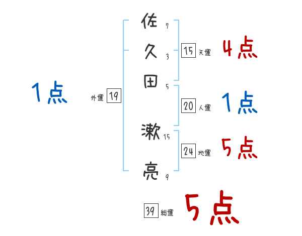 総運![]() | 佐久田漱亮さんの総運は39画の5つ星!社交性に優れ人望が厚い。人の上に立ち成功する。 あなたの人生を表す1番重要な運勢です。生涯を通じて影響する総合運となり、主に50歳以降の晩年期に影響を及ぼします。 |