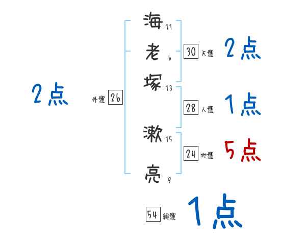 天運![]() | 海老塚漱亮さんの天運は30画の2つ星!浮き沈みの激しさに注意しましょう。 家系が持つ宿命的な運勢を表します。祖先から受け継いだ苗字ですので自分の力が及びません。家柄を象徴します。 |