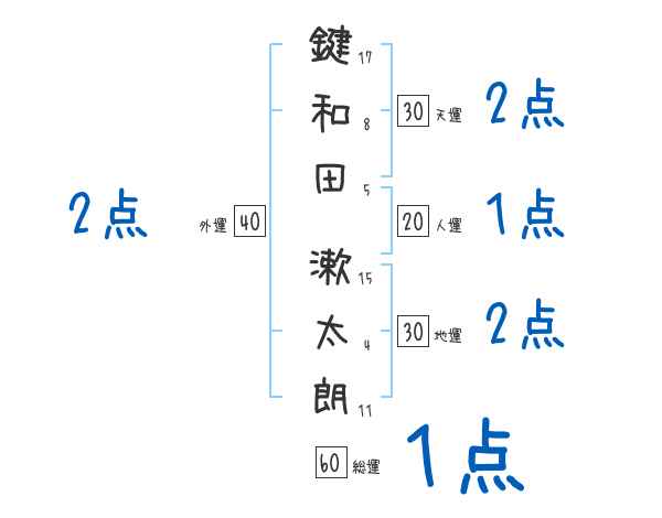 天運![]() | 鍵和田漱太朗さんの天運は30画の2つ星!浮き沈みの激しさに注意しましょう。 家系が持つ宿命的な運勢を表します。祖先から受け継いだ苗字ですので自分の力が及びません。家柄を象徴します。 |