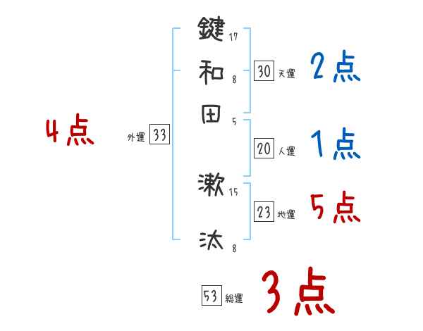 外運![]() | 鍵和田漱汰さんの外運は33画の4つ星!権力志向でプライドが高い。勇気があり運を切り開き成功する。 生活面を象徴する運勢です。外部から受ける影響力を表し、結婚運、家庭運や職場、環境への順応性を表します。 |