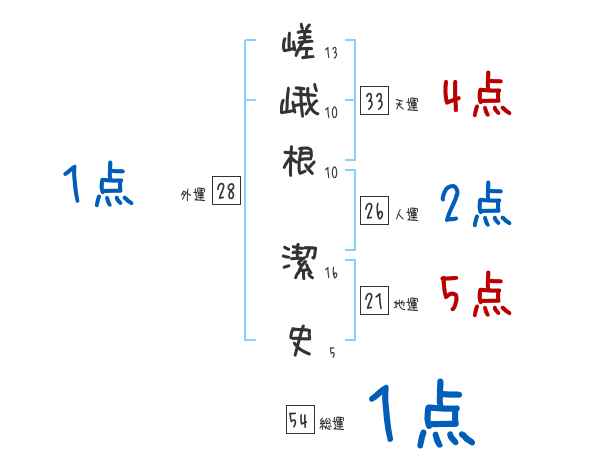 天運![]() | 嵯峨根潔史さんの天運は33画の4つ星!権力志向でプライドが高い。勇気があり運を切り開き成功する。 家系が持つ宿命的な運勢を表します。祖先から受け継いだ苗字ですので自分の力が及びません。家柄を象徴します。 |