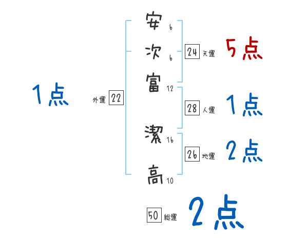天運![]() | 安次富潔高さんの天運は24画の5つ星!家庭運が良く順調な人生。金運にも恵まれる。 家系が持つ宿命的な運勢を表します。祖先から受け継いだ苗字ですので自分の力が及びません。家柄を象徴します。 |