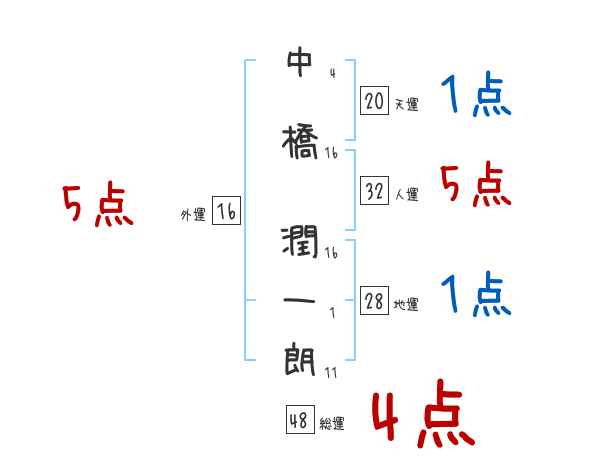 人運![]() | 中橋潤一朗さんの人運は32画の5つ星!柔軟性があり成功する。チャンスが多く金運が良い。 性格や才能などを表す2番目に重要な運勢です。人間関係や協調性、社会的な成功に影響します。主に20歳から50歳ぐらいまでの中年期の運勢を表します。 |