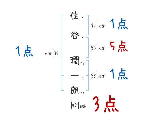 天運![]() | 住谷潤一朗さんの天運は14画の1つ星!人に対して優しいがストレスを溜め込みがち。人間関係のトラブルを避けるよう気をつけましょう。 家系が持つ宿命的な運勢を表します。祖先から受け継いだ苗字ですので自分の力が及びません。家柄を象徴します。 |