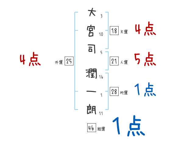 天運![]() | 大宮司潤一朗さんの天運は18画の4つ星!情熱的で剛気。忍耐力があり信頼される。 家系が持つ宿命的な運勢を表します。祖先から受け継いだ苗字ですので自分の力が及びません。家柄を象徴します。 |