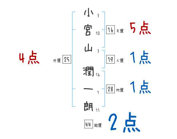天運![]() | 小宮山潤一朗さんの天運は16画の5つ星!人望が厚く大きく発展する。逆転成功が見える。 家系が持つ宿命的な運勢を表します。祖先から受け継いだ苗字ですので自分の力が及びません。家柄を象徴します。 |