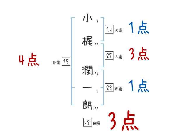 総運![]() | 小梶潤一朗さんの総運は42画の3つ星!病気に注意。多芸であるが消極的でおとなしい。 あなたの人生を表す1番重要な運勢です。生涯を通じて影響する総合運となり、主に50歳以降の晩年期に影響を及ぼします。 |