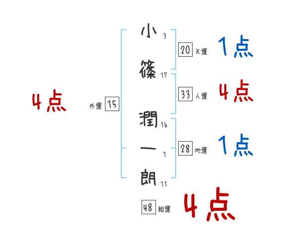 外運![]() | 小篠潤一朗さんの外運は15画の4つ星!人徳があり出世する。順調に物事を進め円満な人生。 生活面を象徴する運勢です。外部から受ける影響力を表し、結婚運、家庭運や職場、環境への順応性を表します。 |