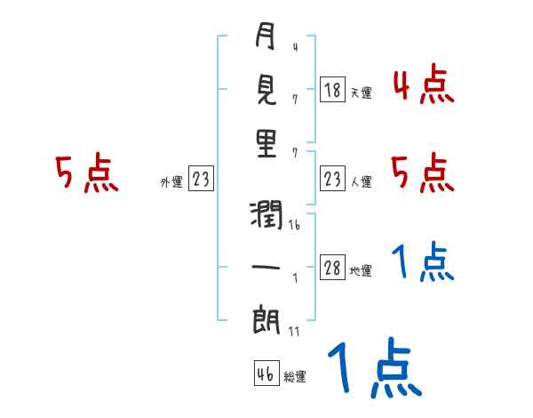 天運![]() | 月見里潤一朗さんの天運は18画の4つ星!情熱的で剛気。忍耐力があり信頼される。 家系が持つ宿命的な運勢を表します。祖先から受け継いだ苗字ですので自分の力が及びません。家柄を象徴します。 |