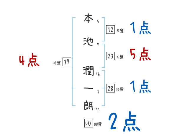人運![]() | 本池潤一朗さんの人運は23画の5つ星!想像力に優れ活力がある。一代で成功し名誉を手に入れる。 性格や才能などを表す2番目に重要な運勢です。人間関係や協調性、社会的な成功に影響します。主に20歳から50歳ぐらいまでの中年期の運勢を表します。 |